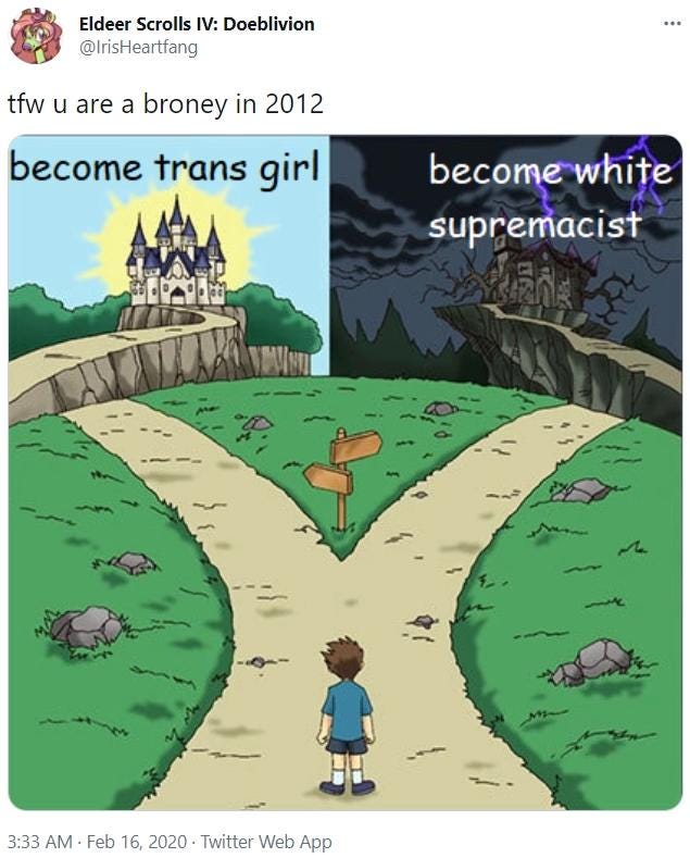 But it also shows how Groypers feel society already views them. One thing you realize studying the young online right is how many of them are, for lack of a better word, marginalized. They are often neurodivergent, disabled, queer, overweight, lower economic status, victims of bullying or abusive parenting. To the extent it’s about masculinity, the core demographic that goes groyper are men unable to fit into dominant narratives, through no fault of their own (at least in the beginning). I think of this meme, which (according to Know Your Meme’s documentation) was one of the key examples in the “Dramatic Crossroads” format’s spread:
