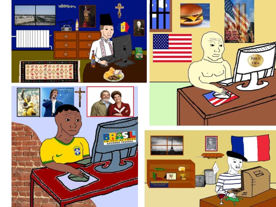 Regardless of how extremely Romanian, Brazilian, or American a Wojak is, these differences are only decor: he isn’t looking at his flag or his national food, he’s looking at his screen — which, presumably, is displaying a 4chan imageboard (or maybe Reddit’s /r/4chan, where this meme took off and found a wider audience). The meme shows national identity playing second fiddle to an online subcultural identity.