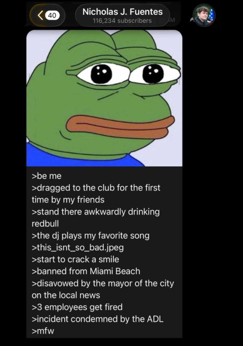 I’m not a clinician, but I’d say he’s likely a psychopath and a drug addict — and partying with Nick Fuentes isn’t really that much better than partying with Peter Thiel. But what’s really going on here?