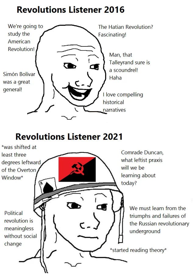 What’s fascinating about Revolutions is the arc of the series. Duncan started twenty years ago as a history nerd working at a grocery fish counter, creating History of Rome in his spare time (which is also brilliant). He started Revolutions as an entrepreneurial and successful podcaster who had essentially helped invent the medium, fresh off History of Rome’s success, wanting to tackle more modern stuff. He began with the English and American revolutions and moved in roughly chronological order, devoting a season to each revolution. Around the Haitian Revolution (season 4) you see the change described in the meme below, which I found on the subreddit for the podcast: